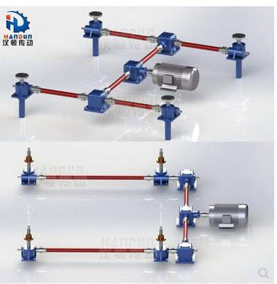 三臺升降機出軸用一臺T型轉向器連接,升降機呈三足鼎立狀態,電機連接在中間一臺升降機的出軸上。
